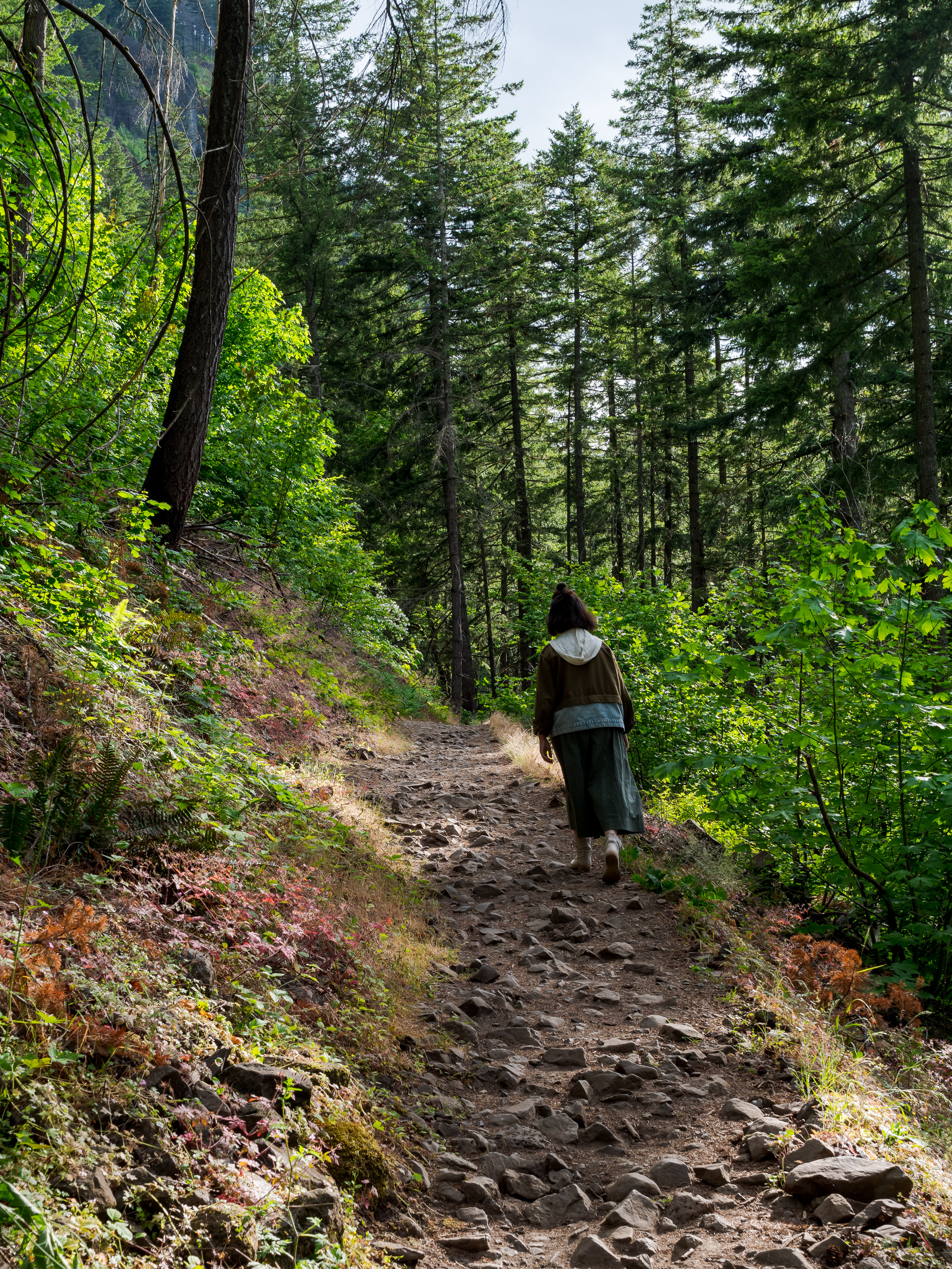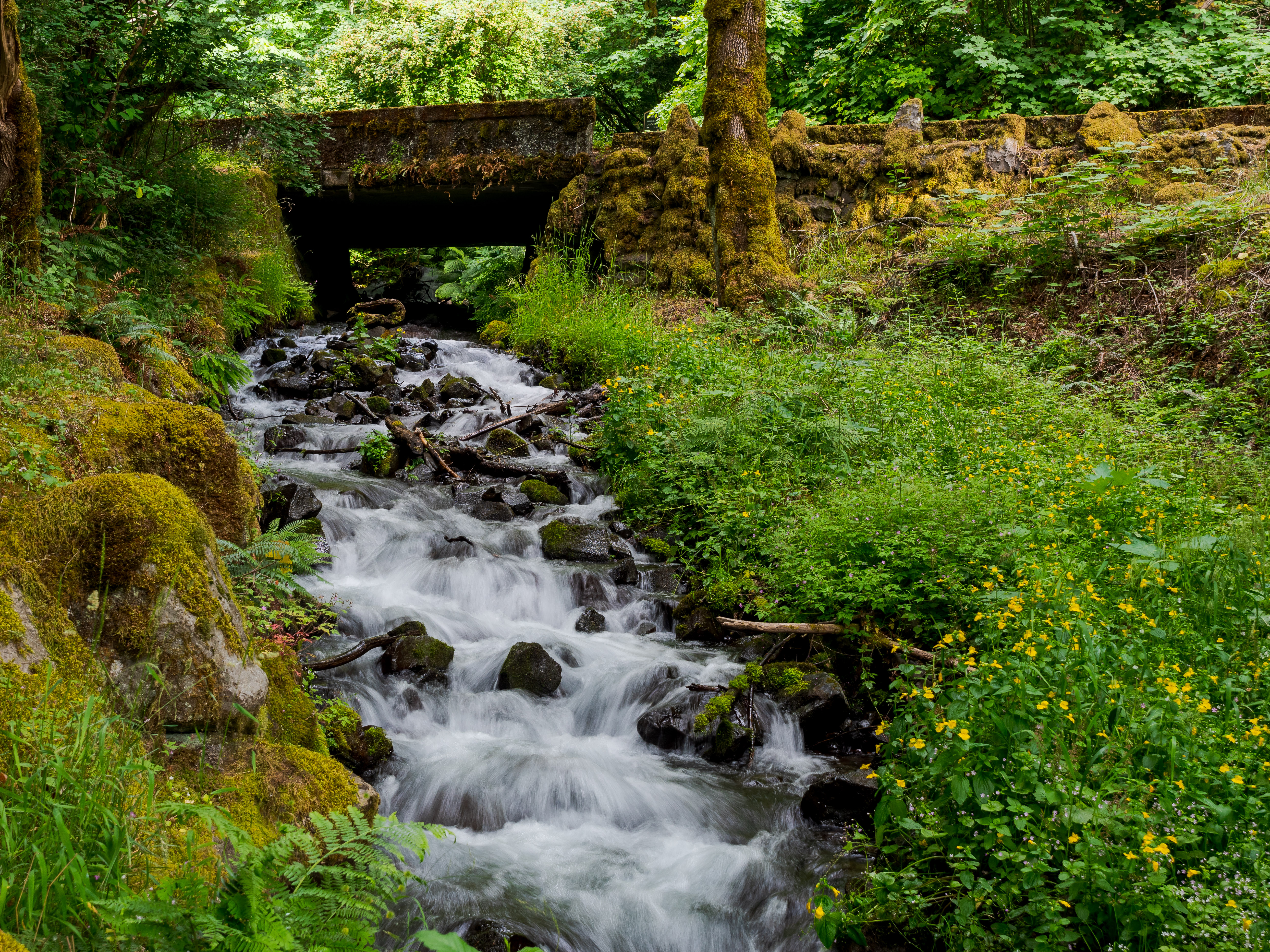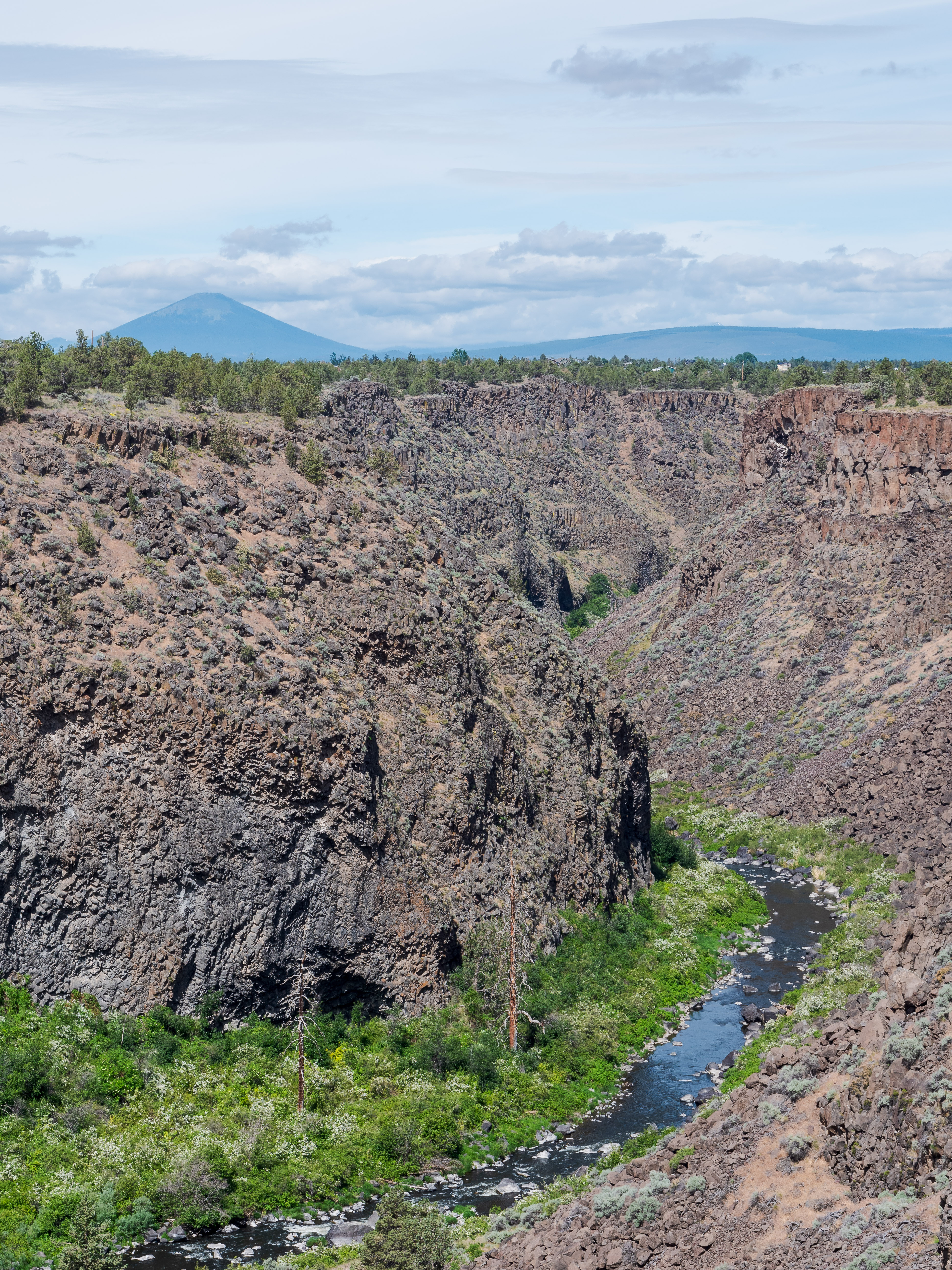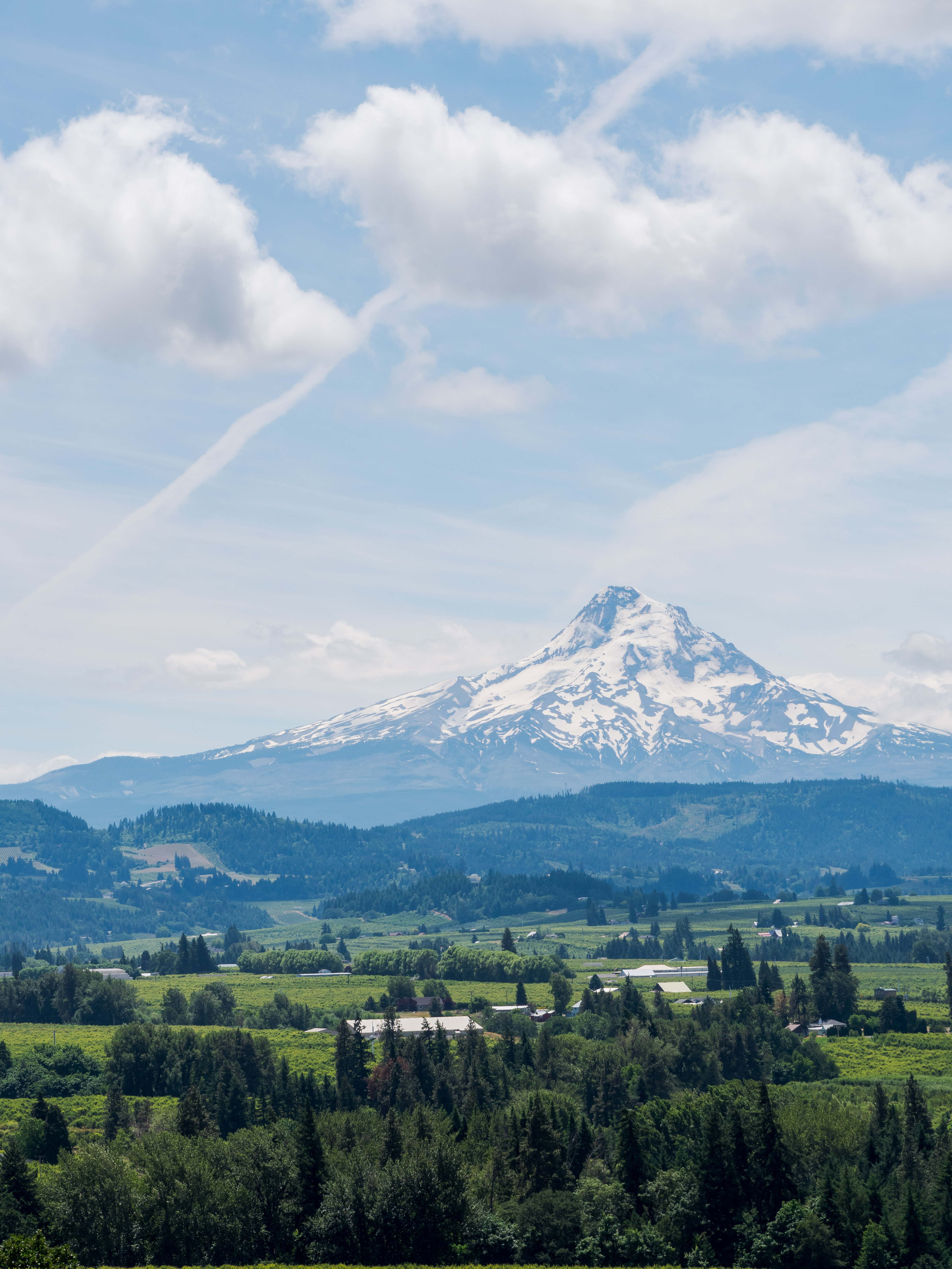 Из Бенда, так толком и не посмотрев город, мы выдвинулись дальше на север: по плану следующая ночевка была в Портленде, а за день мы хотели посмотреть несколько водопадов вдоль южного берега р. Колумбии. Мы выехали в направлении горы Худ, и, в надежде сделать несколько хороших фотографий, решили обогнуть её с восточной стороны. Шоссе, увы, как и в предыдущий день, в основном шло между двумя плотными стенами леса, над которыми виднелась только снежная вершина. Никаких явно обозначенных смотровых площадок вдоль трассы мы не встретили, поэтому, двигаясь почти без остановок, к обеду добрались до города "Река Худ" (Hood River, я не перестаю удивляться оригинальности американских топонимов).