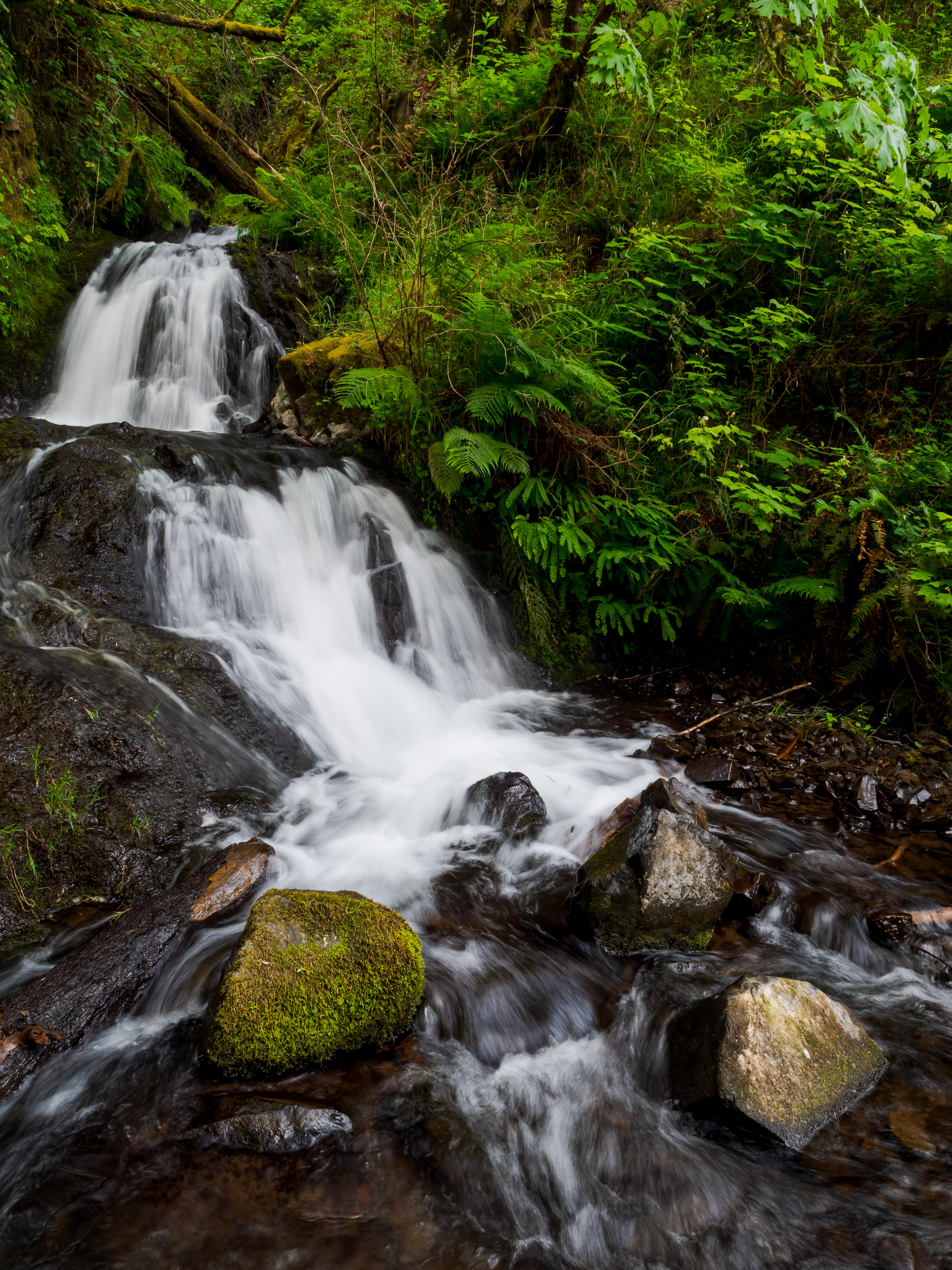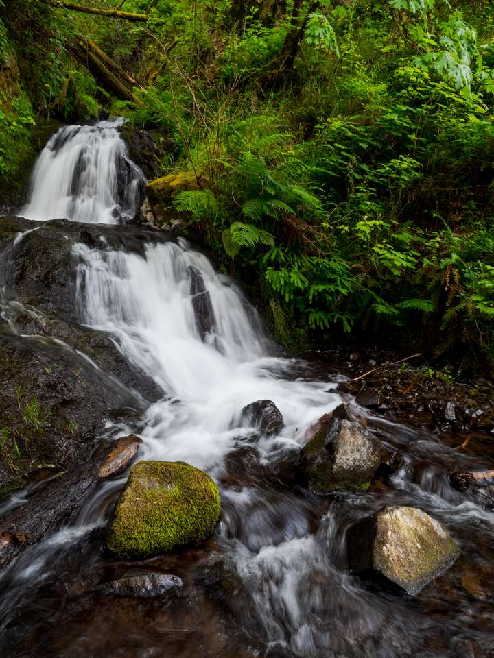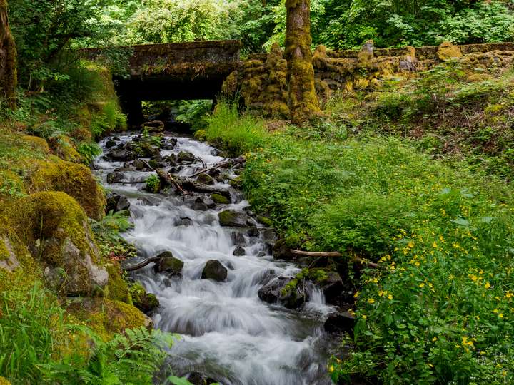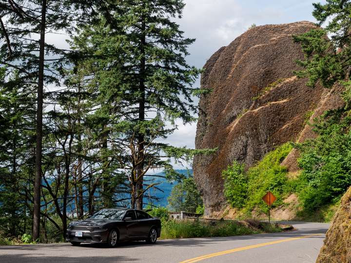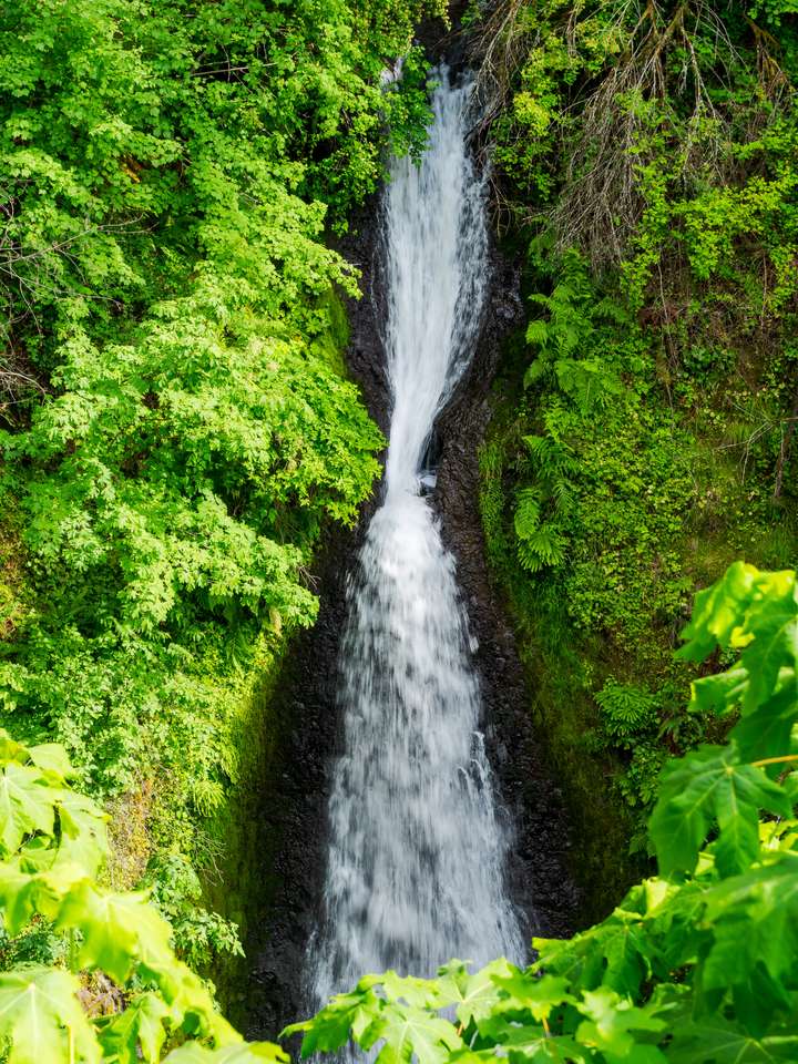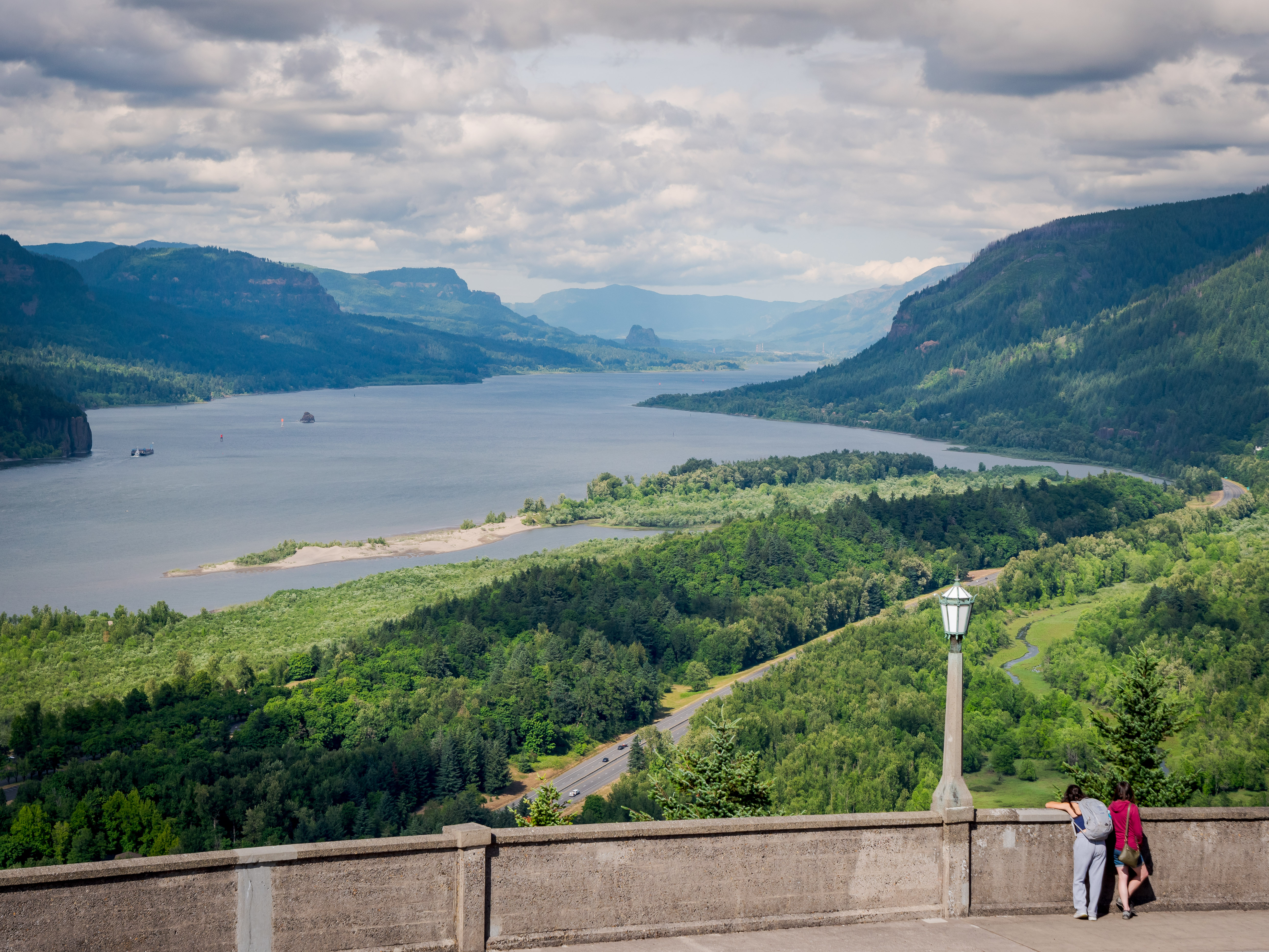 Река Колумбия - естественная граница между штатами Вашингтон и Орегон. Вдоль её гористого южного берега, со стороны Орегона, расположены несколько десятков более и менее крупных водопадов. Мы хотели успеть посетить хотя бы два из них - Bridal Veil и Multnomah. Как и всюду в США, рядом с каждой достопримечательностью оборудованы парковки: приехал, посмотрел, и поехал дальше. Но на календаре была суббота, и, кажется, посетить водопады решила половина населения Портленда. Покружив минут 10 по парковке и отчаявшись найти место, мы решили вернуться к водопадам позднее под вечер, когда основная толпа уже рассосется. Чтобы скоротать время, я проложил маршрут к Vista House - восьмиугольной башне на скале, с которой открывался "открыточный" вид на р. Колумбию.