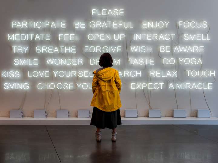 В зале с картинами в стиле "цветового поля" посетительница, увидев нас с Наташей, улыбается: "Оу, ваши куртки идеально сочетаются с этими полотнами. Это мои любимые цвета!"