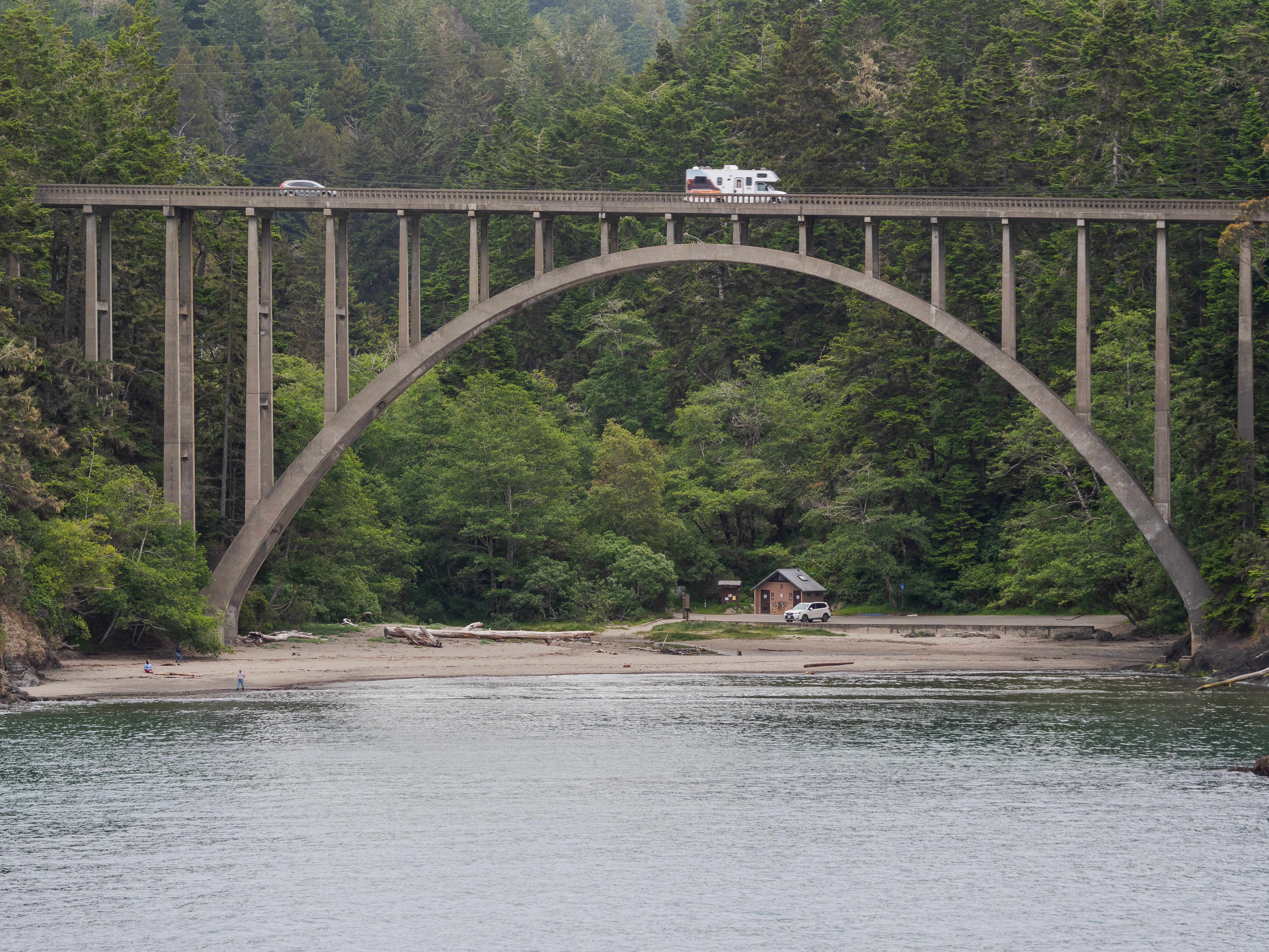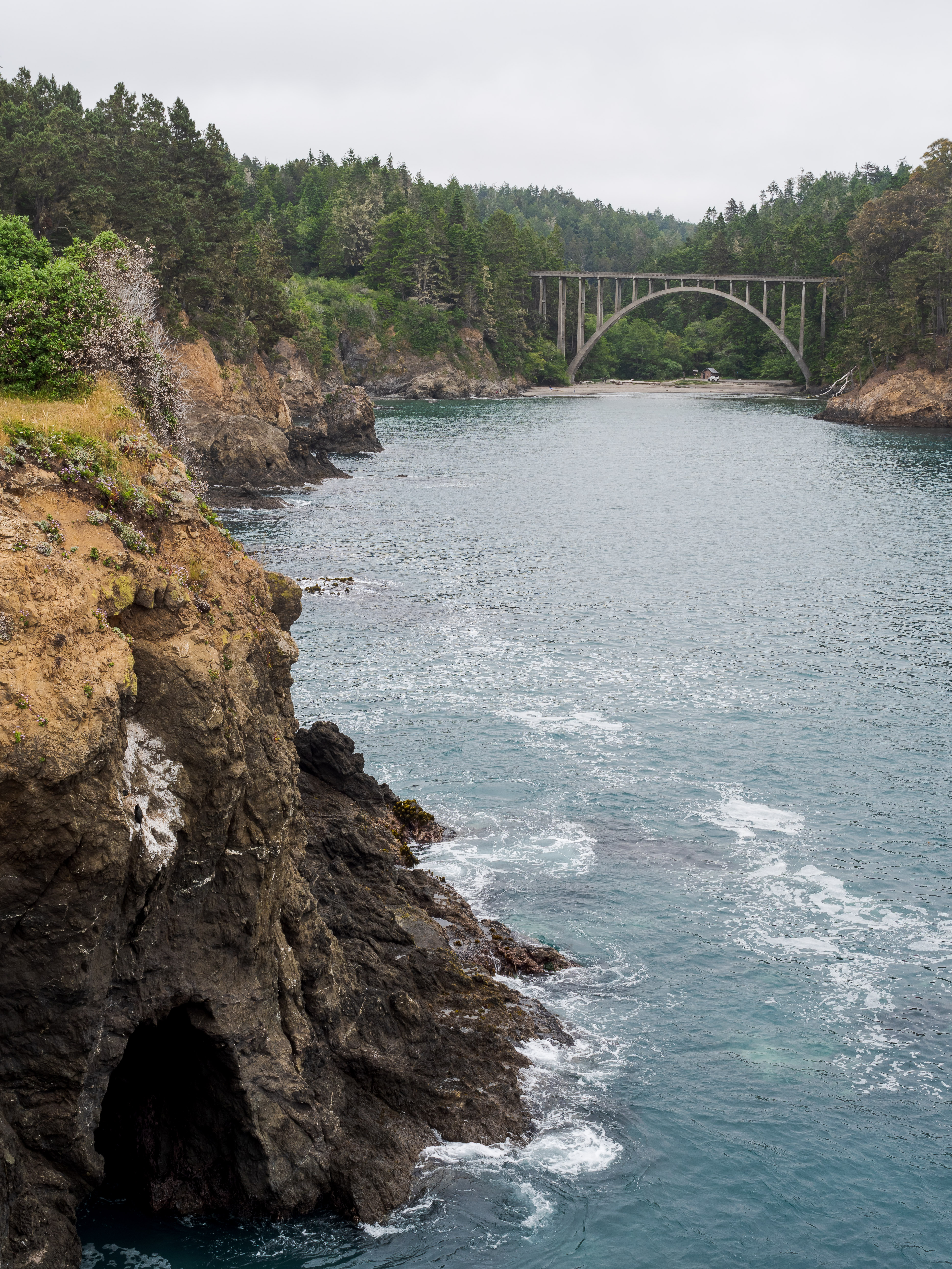 Тут и там встречаются топонимы с "русскими" названиями: Russian Gulch, Fort Ross, Ross Bay и Russian River. Про некоторые достоверно известно, что тут жили русские переселенцы: например, Fort Ross - это буквально "Русский форт". Происхождение других теряется где-то во тьме веков. На вопрос, почему именно это ущелье называется "Русским" интернет достоверного ответа не знает. Вроде бы кто-то из переселенцев сбежал из Fort Ross и обосновался в 80 км севернее, но это не точно.