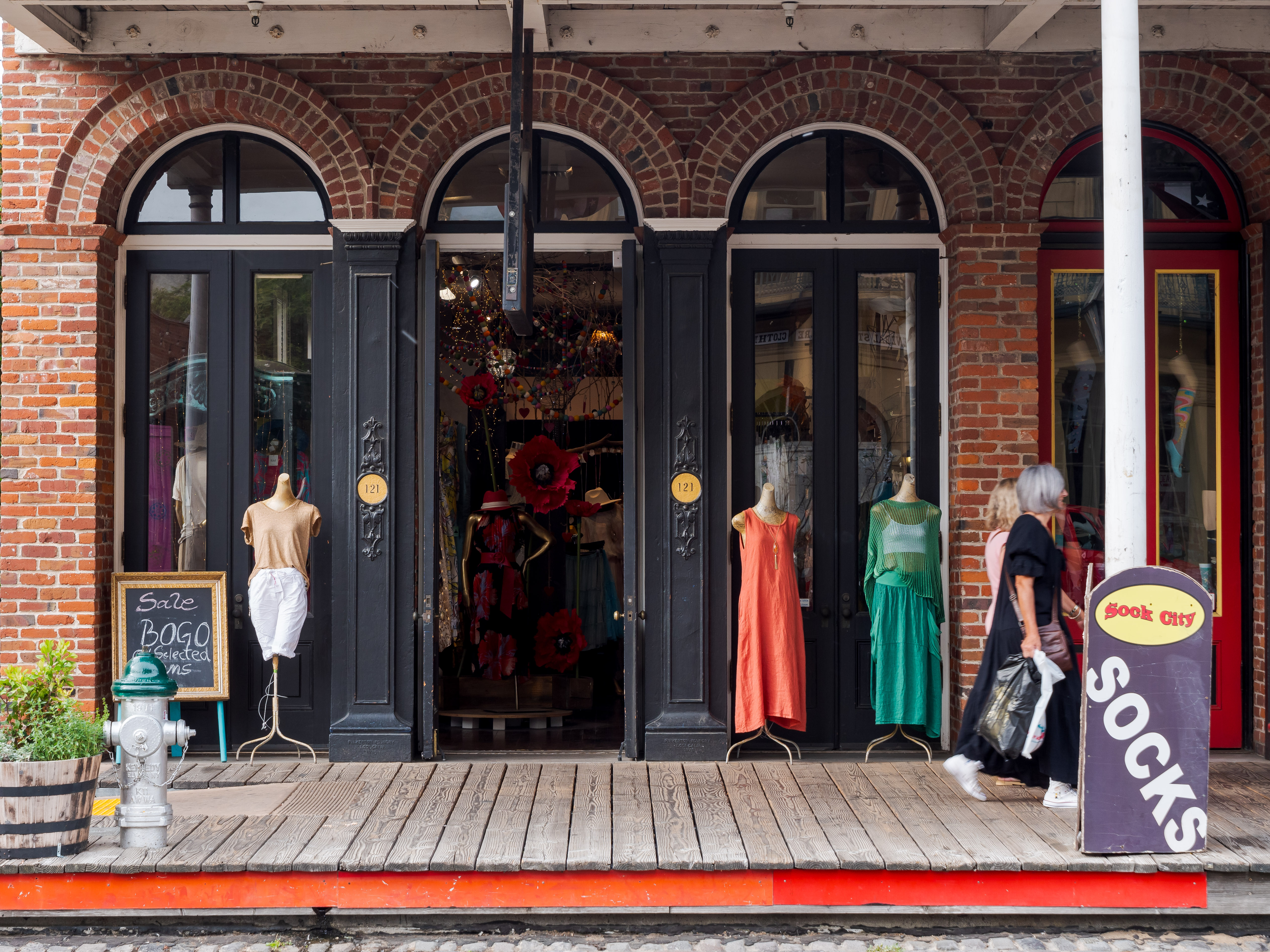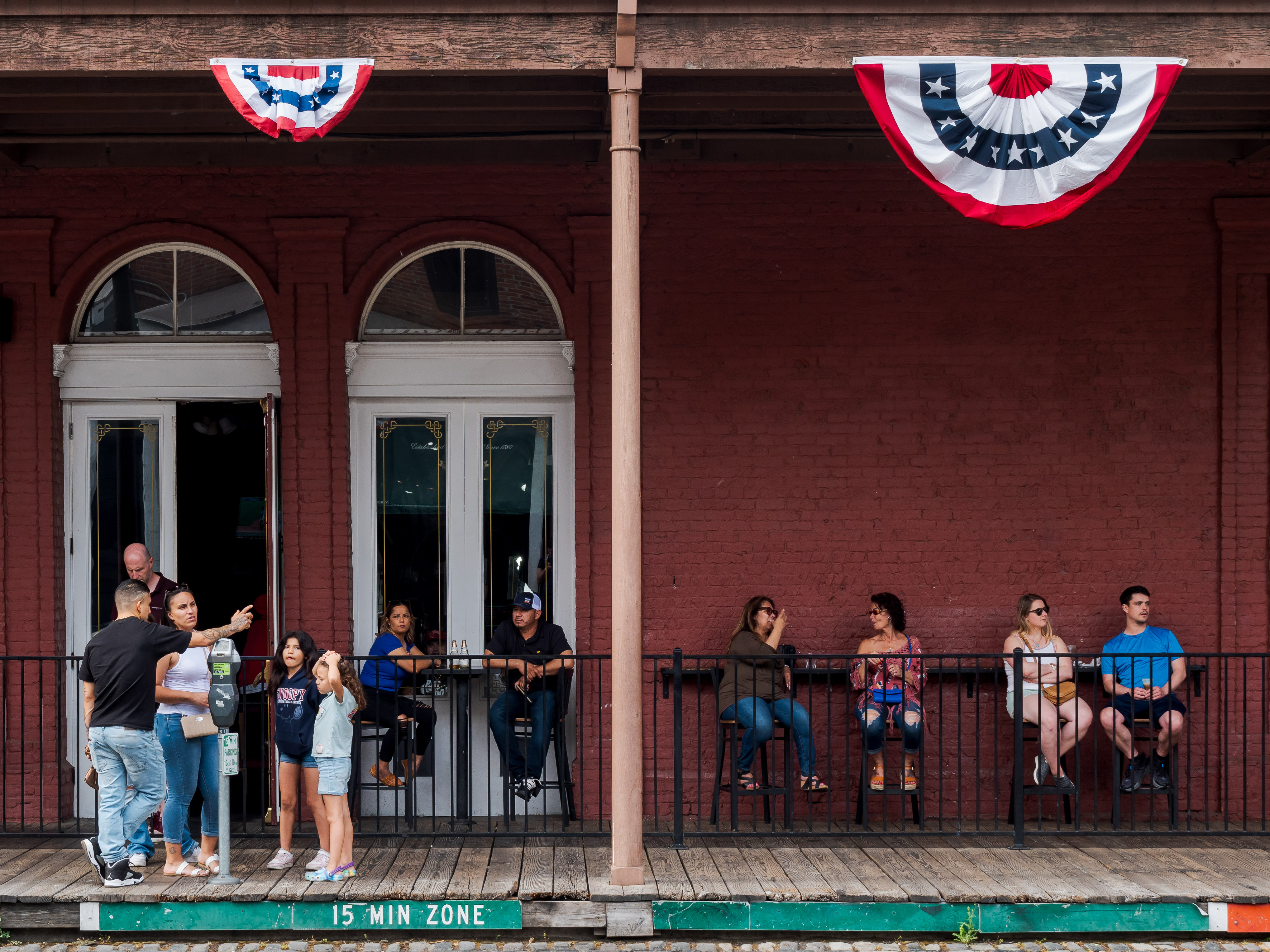 Вдоль берега реки на территории 400х100м власти города постарались сохранить архитектуру, планировку и атмосферу американского города конца 19-го века. С архитектурой и планировкой получилось, а вот с атмосферой - нет. Несмотря на то, что территория района со всех сторон окружена парковками, люди все равно пытаются проехать по нему на автомобилях. Вдоль улиц - парковки, на улицах - постоянная пробка. Видимо, американская (калифорнийская?) урбанистика еще не дошла до того, чтобы ограничивать въезд автомобилей в некоторые районы города.